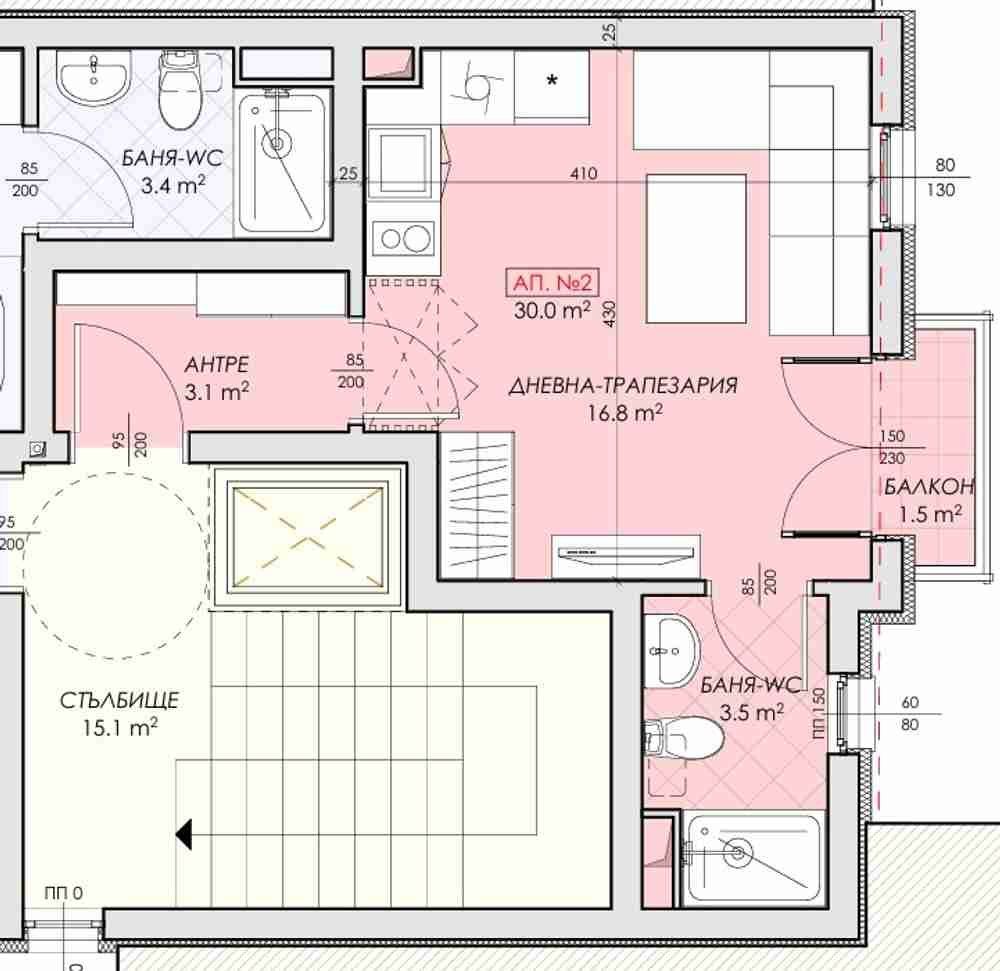 Предлагаме Ви едностаен апартамент в сградата съответно на етаж 2 от 4. Обща площ 41.22 кв.м. чиста площ 30.00кв.м.