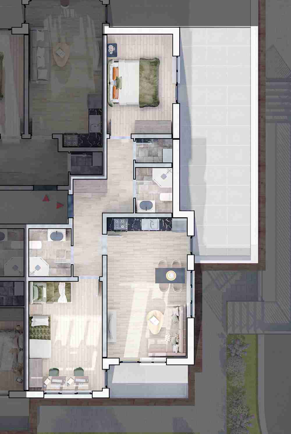 Предлагаме Ви тристаен апартамент в сградата. Обща площ 123.20кв.м. Тераса - 38.93кв.м.