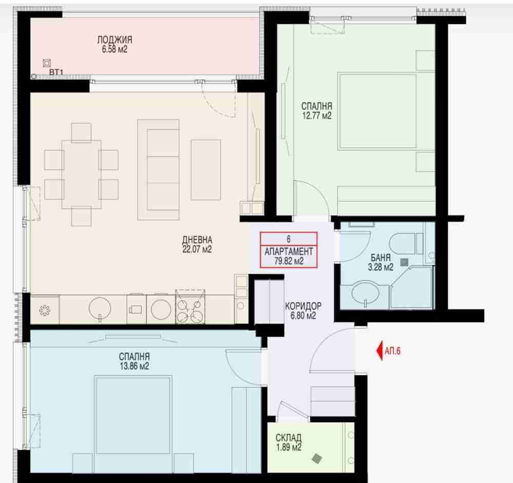 Описание: Представяме Ви апартамент в сграда ново строителство на етап - изпълнение на Ел. и ВиК и предстоящ Акт 16 - 2026г. Сградата се намира в непосредствена близост до множество обществени обекти и паркове, сред които учебни институции, болници, хипермаркети, спортни центрове и основни пътни артерии, с бърз и удобен достъп до градски транспорт. На партерния етаж са разположени, съответно вход на сградата, подходът към жилищните единици, който ще бъде оформен интериорно, с развита социална среда, два гаража, четири складови помещения, стълбищна клетка, асансьор, санитарни възли и три тристайни и четири двустайни апартамента.