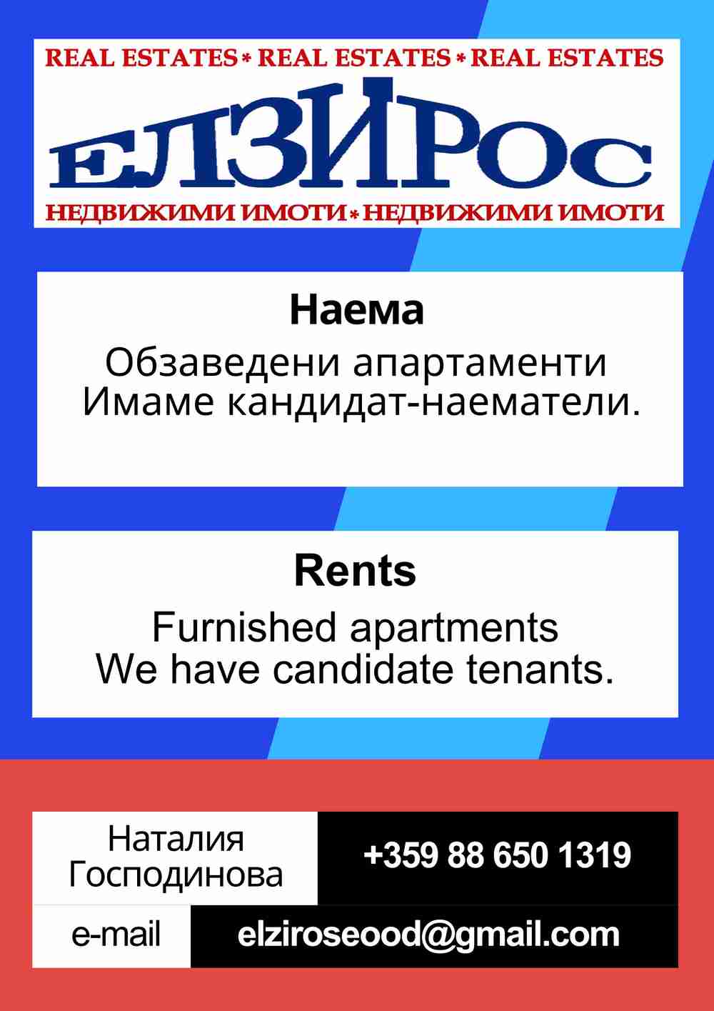 | For contacts: | Agency: ЕЛЗИРОС ЕOOД Country: Bulgaria Town Village: гр.Кюстендил Address: ул. Демокрация №37, ет. 1, офис 2 Contact telephones: 0886501319 E-mail: elziroseood@gmail.com |